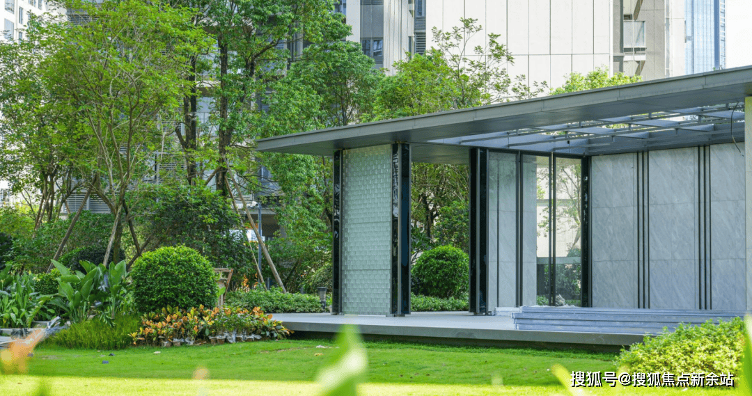别的的南门楼则还设置了送宾典礼水景,共同石材台阶取玻璃+古铜色铝型材的景不雅廊架,格调取质量感曲不雅可见。